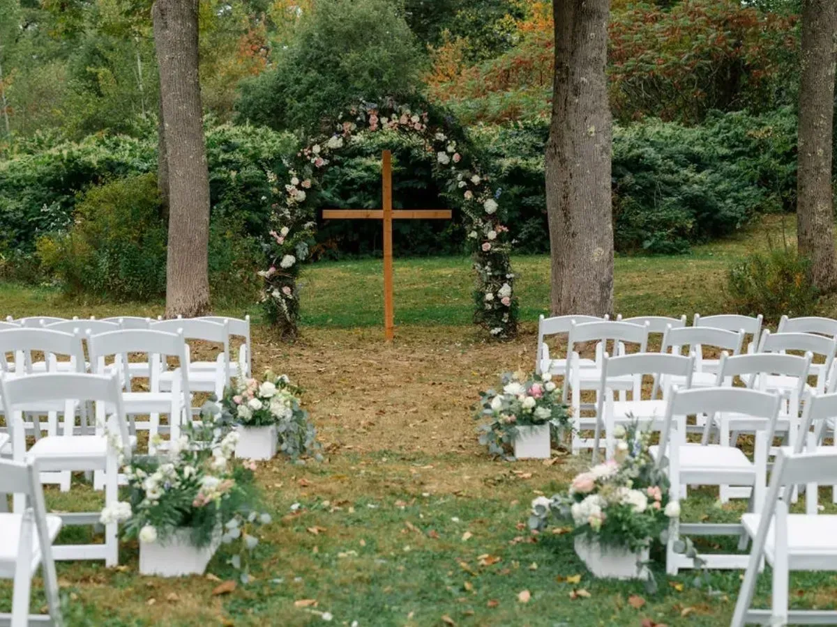 Flexible indoor and outdoor event flow, including ceremony, cocktail, and reception spaces